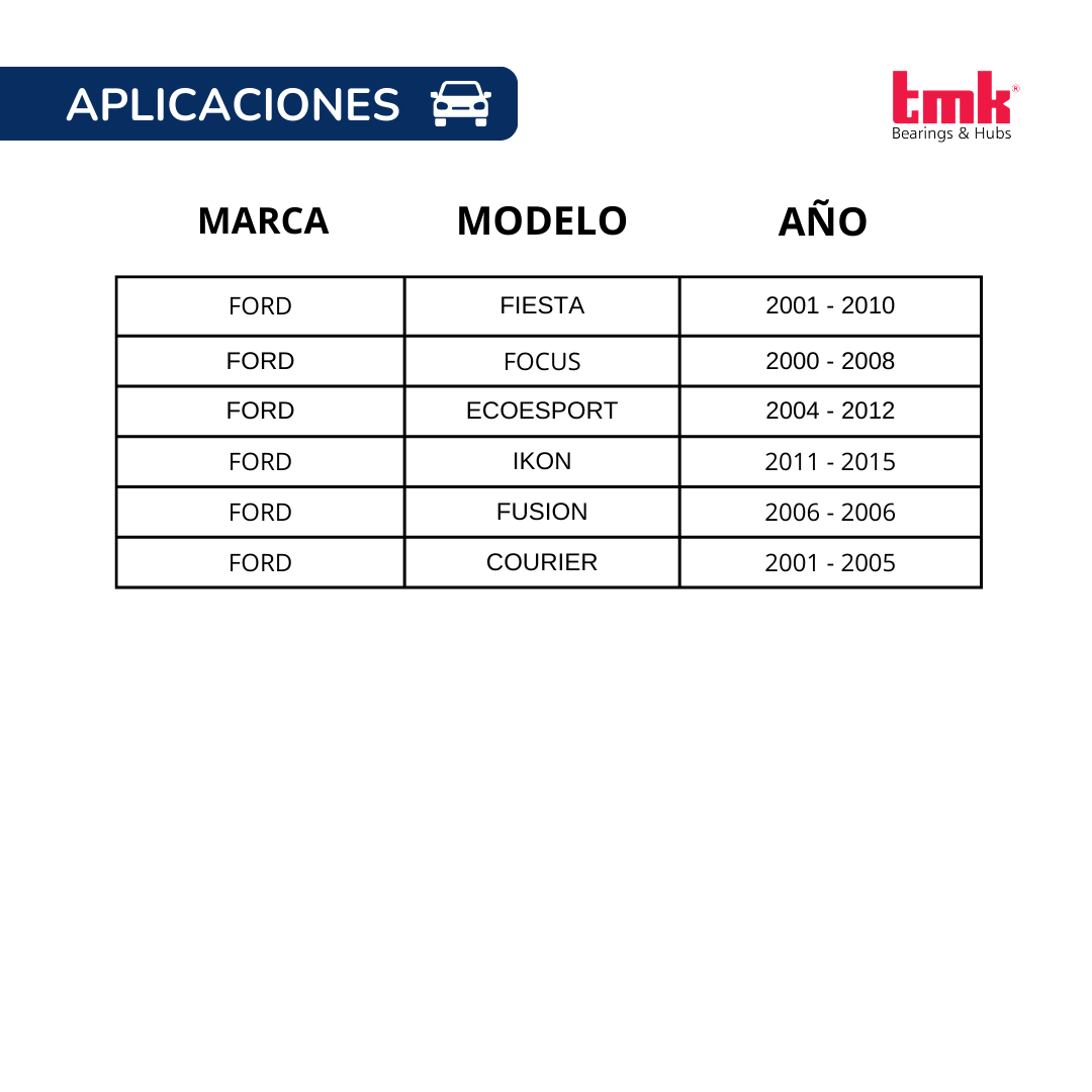 - FORD: FIESTA (01-10), FOCUS (00-08), ECOESPORT (04-12), IKON (11-15), FUSION (06-06), COURIER (01-05).
